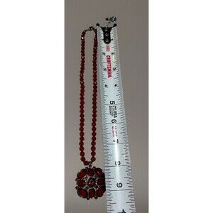 VTG Y2K Liz & Co Red Victorian Goth Bead Pendant Necklace Silver Tone Signed 16"