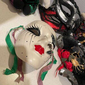 Vintage Y2K Mardi Gras 6 PC Lot Masquerade Masks, Decor & Harlequin Pierrot Jester Dolls.