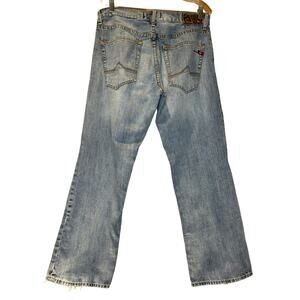 Style - Relaxed fit, 5 pocket, zip/button fly. Naturally distressed. **One small white paint spot on the front right leg.** Can see it in first photo.