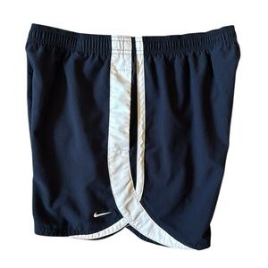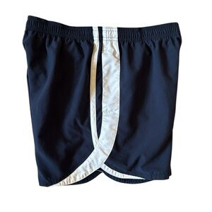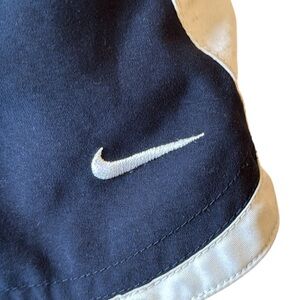 Vintage Y2K Nike Women’s 4.5” Athletic Running Shorts. Elastic waist with drawstring. Classic Black/White. Inseam Side Pockets. White stripes and swoosh.