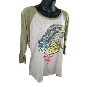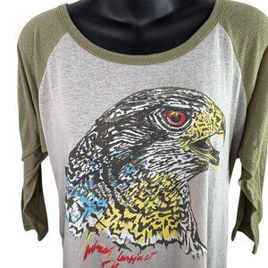 Awesome, vintage, Y2K, baseball-style tee shirt from the brand OBEY Clothing, featuring a distinctive graphic print of a hawk's head. 3/4 sleeves. Design is part of the "Animal Instinct" line. Unisex style. Sizing is a men’s medium but could be a women’s extra large. See measurements below and compare with something you own. Wash wear pilling and thin, lightweight material.