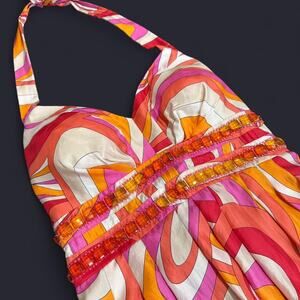 Vintage Y2K OC OC by Oleg Cassini pink & orange groovy retro pattern acrylic beaded 100% silk maxi halter dress with padding - Size 4/Small, see measurements below!