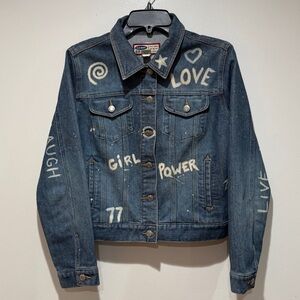 Vintage 2001 Old Navy denim jacket in very good preloved condition. This one-of-a-kind jacket features hand-done bleach artwork with phrases like “GIRL POWER,” “PEACE,” “LOVE,” and “USA,” giving it a true Y2K hippie aesthetic. Condition is excellent, with only a faint, barely noticeable stain on the sleeve. Perfect for casual streetwear, retro outfits, or collectors of unique vintage denim.