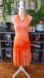 Thin, sheer nylon mesh overlay, in a bright orange (or tangerine) color tie dye print, with floral stitching & tiny orange sparkly sequins. Fully lined, slip dress, underneath, in orange/ peach color. Sleeveless, halter style, v neckline, with long nylon mesh neck ties. Thin padding (non- removable pads). Mid side ruching, giving a beautiful slimming silhouette. Flowy, asymmetrical hem; making this dress great for dancing! Midi, right below the knees (depending on height), length.