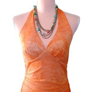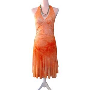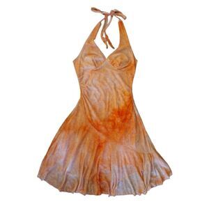Vntg Y2K Sparkly Orange Tie Dye Floral Asymmetrical Halter Slip Dress