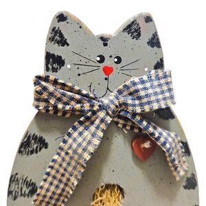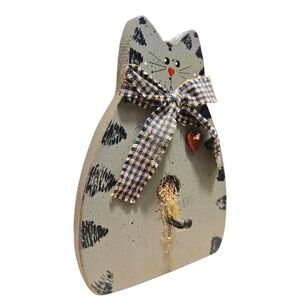 primitive cat decor, farmhouse cat figurine, rustic wood shelf sitter, country cat statue, gingham bow, heart motif, Ohio Wholesale Inc, Americana decor, freestanding cat, folk art cat, rustic cottage core, y2k folkart decor, Country cottagecore, freestanding figure
