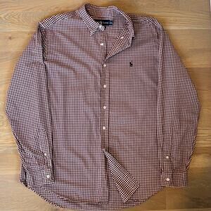 VTG Y2K Ralph Lauren Classic Fit Button Down Shirt Gingham Pony Logo Mens XL. 100% cotton. Maroon and cream check gingham. Dark forest green stitched pony logo. Great shirt for Christmas/winter season! Classic loose, relaxed fit. Excellent condition. Smoke free home. NEXT DAY SHIPPING.
