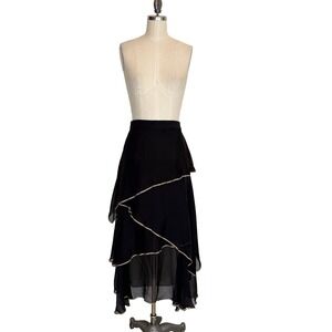 Vintage Black Asymmetrical Ruffle Midi Skirt – Sheer Overlay – Boho Gothic Romantic