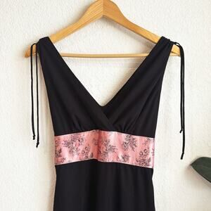 Specific/Style: Asymmetrical hemline, empire waist with fixed floral satin tie back, sleeveless, chiffon material stretchy