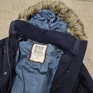 VTG Y2K Ruehl No.925 Women's Puffer Coat Faux Fur Hooded Jacket Small Navy Blue
