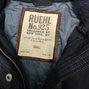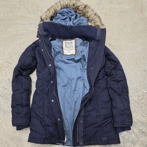 Keywords: Ruehl No.925, puffer coat, faux fur hood, winter jacket, navy blue coat, womens coat, small size, quilted
