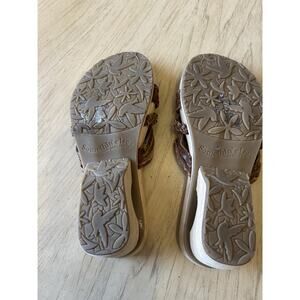 The VTG Y2K Sketchers Somethin’ Else Leather Braided Platform Sandals in Cali Wood are a stylish and unique pair of vintage sandals for women. With a slip-on style and wedge heel, these brown sandals feature beaded accents and are made of leather. The platform design adds extra height while maintaining comfort, making them a fashionable choice for those looking to add a touch of retro flair to their footwear collection. Perfect for casual outings or summer adventures, these Sketchers sandals are sure to make a statement.