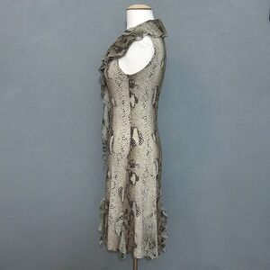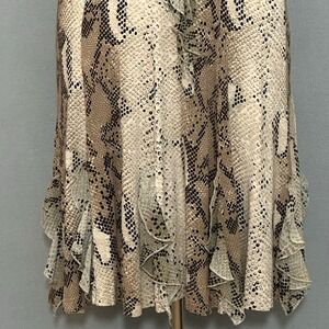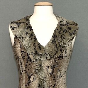 Keywords: Sao Paulo dress, snakeskin print dress, sleeveless dress, ruffle trim dress, size 4 dress, viscose blend dress, animal print dress, beige and black dress, cocktail dress, party dress, women's fashion, designer dress, classic dress, unique dress