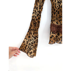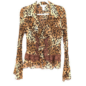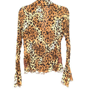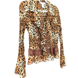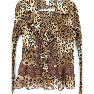 VTG Y2K Sheer Leopard Luxe Mob Wife Maximalist Brown Ruffle Lace Chiffon Top LG