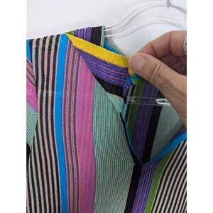 Vintage Y2K metallic knit sweater top in bold multicolor stripes. Features a collared V-neckline, 3/4 sleeves, and a lightweight sheer knit that layers perfectly. The shimmer and retro pattern make it ideal for festival looks, 2000s-inspired streetwear, or statement layering.