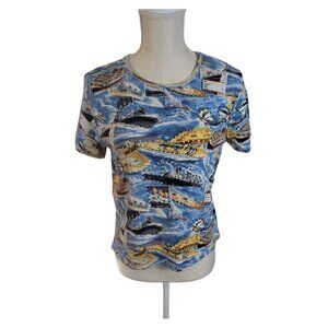VTG Y2K Take Two Womens Sz Large Blue Printed Beaded Cotton Knit Top Cruise Ship