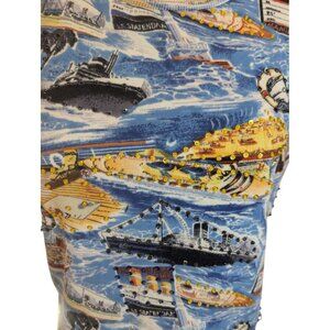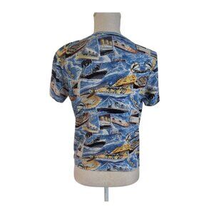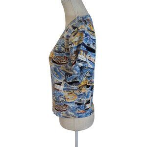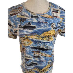 Vintage Y2K Take Two Womens Sz Large Blue Printed Beaded Cotton Knit Top Boats Cruise