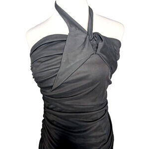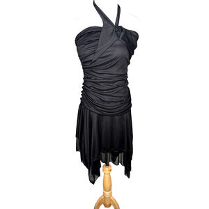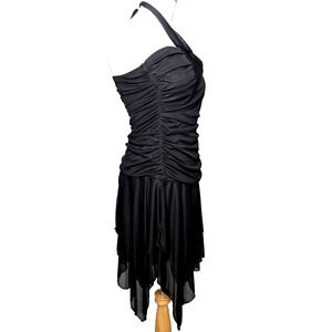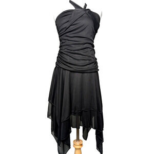 Asymmetrical halter bow tie back black dress. Ruched, gathered, pleated throughout bustline and bodice. Hi-low hem flowy mesh handkerchief layered sheer skirt.