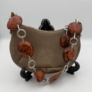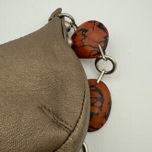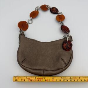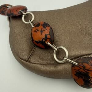 Chic and unique Viva Bags of California mini purse featuring a subtly metallic leather(?) body and statement resin bead handle in warm amber and marbled tones. Compact and stylish, this bag is the perfect accessory for a night out, special occasion, or as a collectible Y2K handbag. A fun statement piece that blends boho, retro, and glam styles—great for collectors and fashion lovers alike!