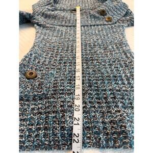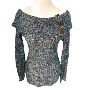• Condition: Excellent preowned, no stains, holes, or flaws• Size: Women’s Small; curve-hugging hip-length fit• Measurements: Pit to pit 15”, length 22.25”, sleeve 21”• Features: Wide off-shoulder cowl neckline, oversized button trim at collar, button-accent pocket, ribbed chunky knit• Fabric: 55% Ramie, 30% Acrylic, 15% Mohair (soft textured)• Color: Teal & dark brown marled knit (alt: ocean teal, espresso brown, seafoam fleck)• Style: Y2K vintage, retro 90s, curve-hugging sweater, figure-flattering, indie sleaze, soft grunge, whimsygoth• Occasions: Fall/winter layering,