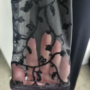 Sheer top and long sleeves are embroidered with black flowers/vines