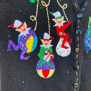 VTG Y2K White Stag Ugly Winter holiday Christmas sweater vest featuring Elves swinging from ball ornaments - i call this one the Miley Cyrus Elves Came in Like a Wrecking Ball Ornament