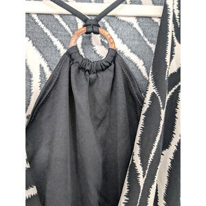 Layered tank with faux wrap outer layer and halter inner layer with wooden ring detail.