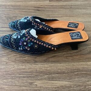 VTG Y2K iOS black ornate beaded pint toe kitten heel mules. Made in Indonesia 10