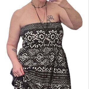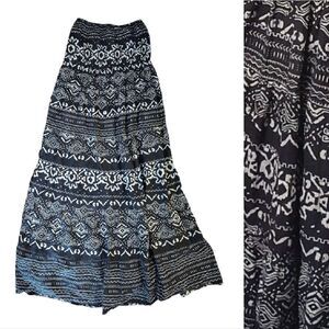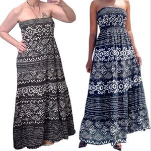 Black, with white geometric/ aztec prints. Strapless, stretch smocked top. Full, tiered, maxi length (@ 48.5"l). A line design. Feels like soft cotton material.