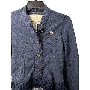 Stylish Abercrombie & Fitch blue jacket featuring a ruffle hem and button-front design. Comfortable cotton/polyester blend perfect for casual everyday wear.
