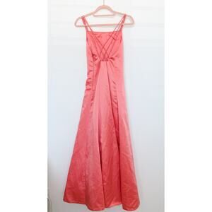 Style: y2k, promcore, regencycore, 2000s formal, strappy dress, coquette, slay era, sweet 16, coral satin gown, spaghetti straps, strappy back, special occasion, evening gown, bridesmaid style, silky slip look, minimalist glam, true vintage, elegant backless detail, satin sheen, romantic