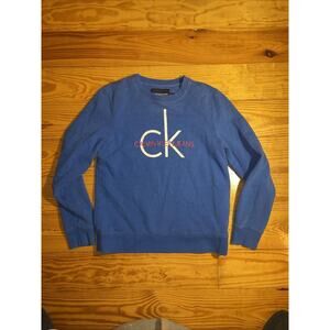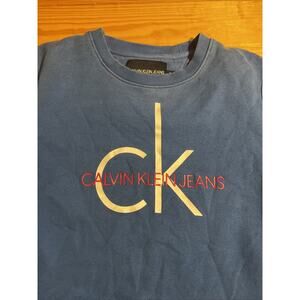 This vintage Y2k Calvin Klein Jeans crewneck sweatshirt is a rare find in men's size medium. Made from a cotton blend material, it features a classic blue color with a logo accent. The extra-slim fit and hipster designer style make it a unique and stylish addition to any wardrobe, suitable for casual wear or travel.
