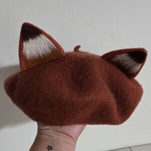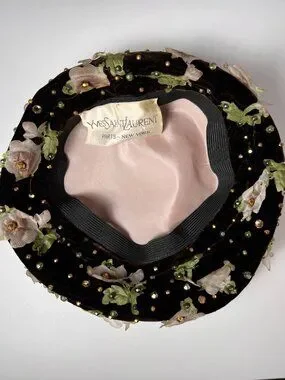 VTG YSL Chocolate Brown Beret Velvet Hat with Floral Motifs and Rhinestones 60's