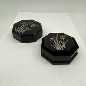 VTG Yamanaka Japan Jewelry Trinket 2pc Nesting Boxes Black Lacquerware Floral