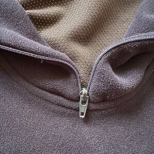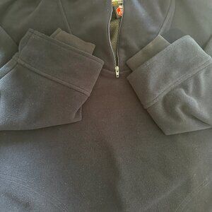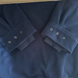 The Zero Restriction Golf Outerwear Windstopper pullover in navy blue is a vintage piece made from 100% polyester with a comfortable suede feel. This mid-length jacket features a pullover design with a 1/4 zip for added versatility. It is perfect for activewear, particularly golf, as it is wind-resistant and suitable for all seasons. The jacket includes front pockets for convenience, back pleats, adjustable snap ribbed wrists hems, and is machine washable for easy care. Please check your measurements to the approximate measurements provided. Made in the United States and it comes from a pet and smoke free environment.