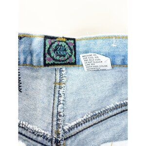 These vintage Zip Code denim shorts in a light wash with a floral print are perfect for a boho chic look. Made from 100% cotton in the 1990s, they have a junior size 5/7 with a 23" waist. With a retro feel and a touch of nostalgia, these shorts are a stylish addition to any wardrobe, showcasing a unique blend of style and comfort from a bygone era. Made in Hong Kong, these shorts are a must-have for vintage clothing enthusiasts looking for a standout piece to add to their collection.