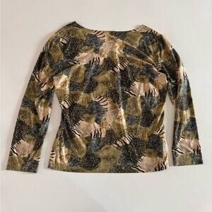 Vintage animal print top. Super stretchy, very soft. It’s a hodgepodge of animal prints — cheetah, leopard, tiger, snake and zebra! Paper tag is faded. I’d call it a medium. Very flattering. Approximately 20” pit to pit and 22” in length.