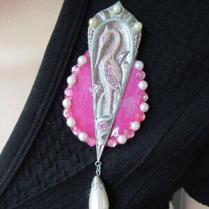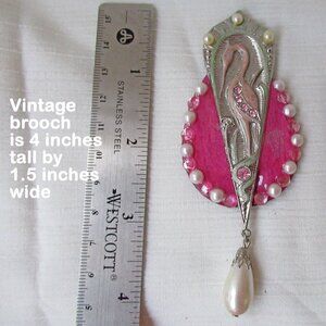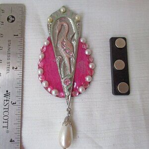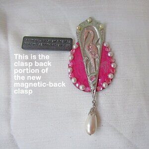 Featuring a pastel pink and green enamel bird on oblong pointed silver tone metal, I updated this charming vintage brooch for the 21st century. The bird is positioned standing with pastel pink and green enamel trim and the wings are tiny pink rhinestones. I removed the old pin backing and then remounted the brooch on a pink teardrop shaped disk. Around the edges I added pink rhinestones and faux white pearls to coordinate with those already in that brooch. Once those were in place I used a shiny gloss finish. For the final step I added a new magnetic back clasp.