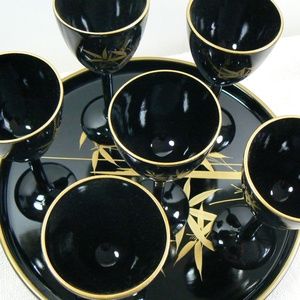 Vintage, Black Lacquer made in Japan,bamboo design, Set of 6 goblets / footed glasses and tray with gift box. Great vintage condition!