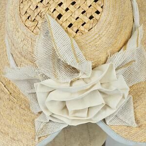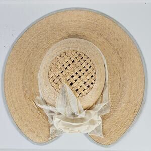 VTG fine woven ladies straw hat vented crown fabric floral trim