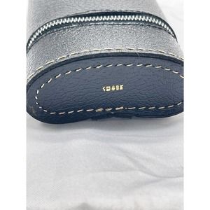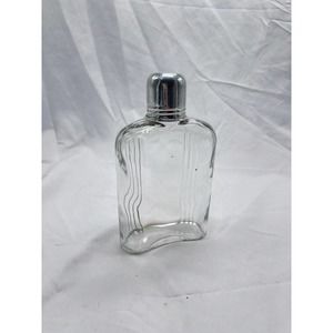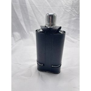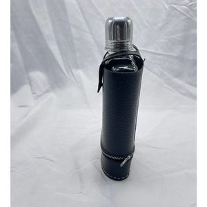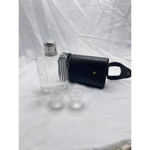 Vintage flask and cup set in leather carrying case. This flask is glass with a silver plated lid. The bottom of the carrier unzips and features two plastic shot glasses. This is in very nice condition considering age. The leather is nice and crisp with little to no wear, the glasses are in outstanding condition as are the cups. Please see pictures for measurements.