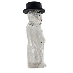 Vintage glass perfume bottle of man wearing a top hat and tuxedo. He holds a cane and carries a bouquet of flowers.