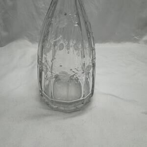 Vintage mid century, harp stopper decanter. This decanter has frosted/satin flowers around the perimeter. Beautiful, heavy harp style stopper. No chips, no cracks. See pictures for measurements.