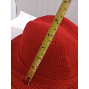 Pre-owned red Derby shaped winter hat, fascinator, balaclava. Long soft scarf attached that ties under chin .isotoner model "Weather Shed". How is slightly rigid to keep shape, it is satin lined, cute little bow hat band and stiff brim.