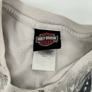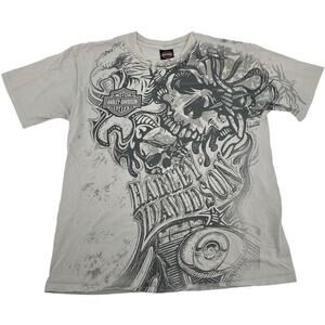 Vintage y2k 2009 Men's Grey White Harley Davidson Skull Motorcycle Eagle AOP Graphic T Shirt XL
