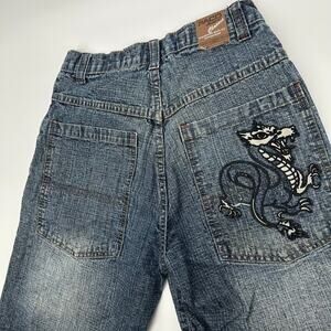 Vintage y2k Youth Boys Faded Paco Jeans Company Chinese Dragon JNCO Style Blue Denim Jean Shorts Sz 14