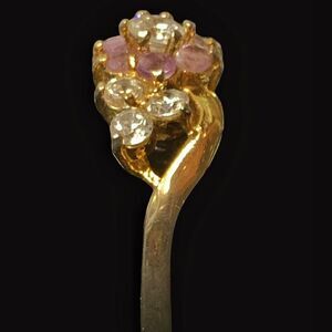 Very pretty vintage cocktail ring by lind, it has a lovely ameythyst flower in the center with a CZ Diamond in the center, other CZ accent stones on a Gold plated setting.Lots of pretty sparkle, Size 9.5. Please see all photos for full description.