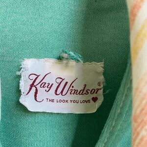 Authentic 1960s Kay Windsor dress — true deadstock vintage, union-made in the USA. Structured A-line silhouette with gold-tone buttons, patch pockets, matching belt, and coordinating striped scarf. Think Joan Holloway meets Pan Am — perfectly tailored, crisp, and flattering.