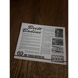 Vintage 1990 Brett Bodine 8x10 Quaker State Racing driver card from King Racing. Features full-color imagery of Brett Bodine, the #26 Quaker State Buick, and detailed sponsor logos like STP, 76, DieHard, Gatorade, Edelbrock, and more. Includes historical information about Bodine’s career, his team, and the Quaker State brand. Also shows crew chief Larry McReynolds, engine builder Lou LaRosa, and team owner Kenny Bernstein.