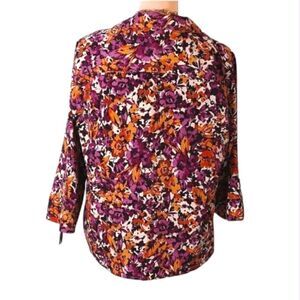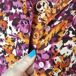 button down front, with light purple buttons, collared, long sleeves with inner tabs, to button to quarter sleeves